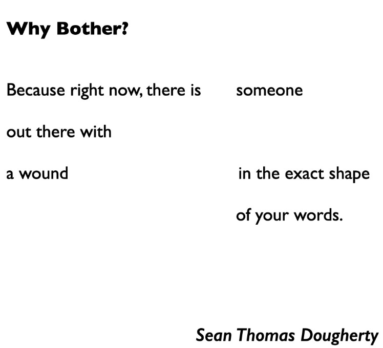 Item three. If you write books, or make art, keep writing. Keep making your art or your music or your craft, because no one else is going to make your version of it if you don’t. For more on this, see the above “Why Bother” poem. It’s always good advice.